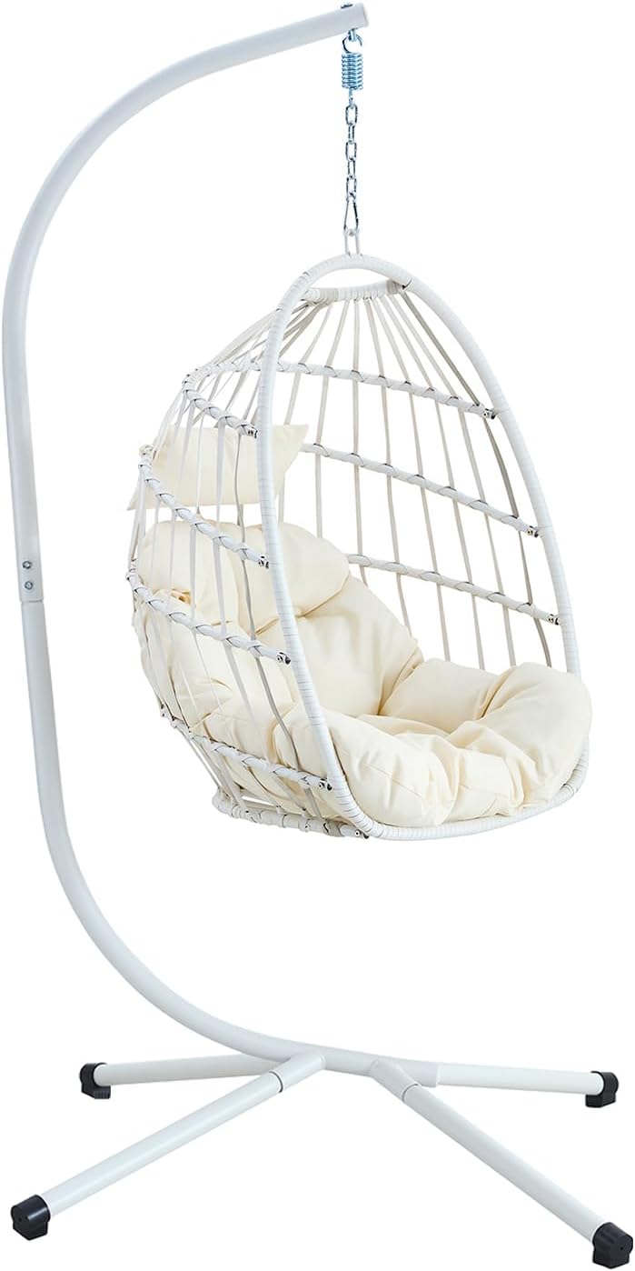 Sedia sospesa a forma di uovo con cuscino e supporto, pieghevole, per interni ed esterni, elegante amaca per il relax bianco